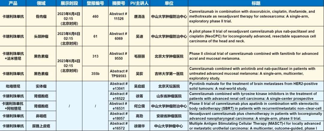 此外,在头颈肿瘤、黑色素瘤、骨肉瘤、鼻咽癌、肾细胞癌、尿路上皮癌等多个领域,卡瑞利珠单抗、吡咯替尼等产品相关研究一共入选了4项壁报展示和5项线上发表,彰显了Ag尊龙凯时医药强大的自主研发综合实力。